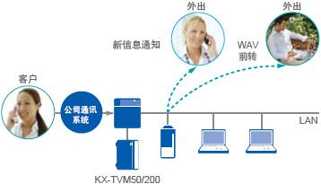 您可配置KX-TVM50/200,接收到新信息时通过邮件通知。远程登录您的邮箱然后接听您的信息。邮箱附件可发送WAV格式的语音文件。您能很容易的通过E-mail把它转发给其他同事,同时在您自己的电脑里做一个备份。